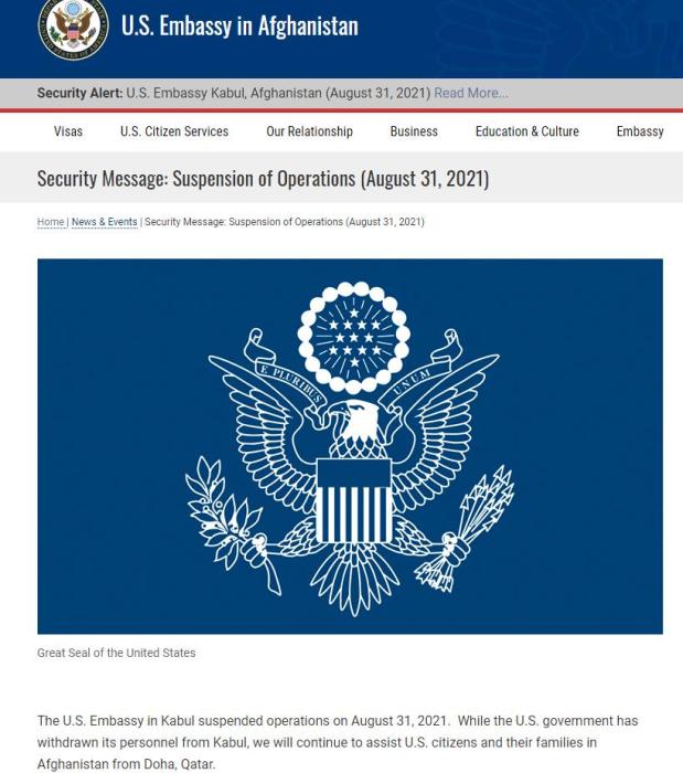 大公文匯網報道,美國駐阿富汗大使館網站發布聲明稱,於當地時間8月31日起暫停運作。