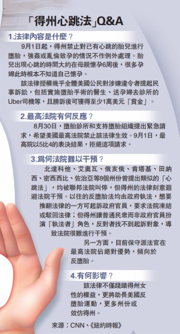 大公報綜合《紐約時報》、美聯社、路透社報道:美國得州9月1日起正式實施全美最嚴格的反墮胎法,禁止在檢測到胎兒心跳,即妊娠約6周後進行墮胎。診所及女性權益組織批評該法律與著名的「羅訴韋德案」判例相悖,但保守派居多的美國最高法院拒絕阻止其生效。值得注意的是,得州政府將執法權限下放給普通美國民眾,用「賞金」鼓勵他們起訴任何協助懷孕超過6周女性墮胎的人。法律專家稱,此舉讓美國倒退回秩序缺失的西部拓荒時代;這種先例一開,美國人權恐再無保障。