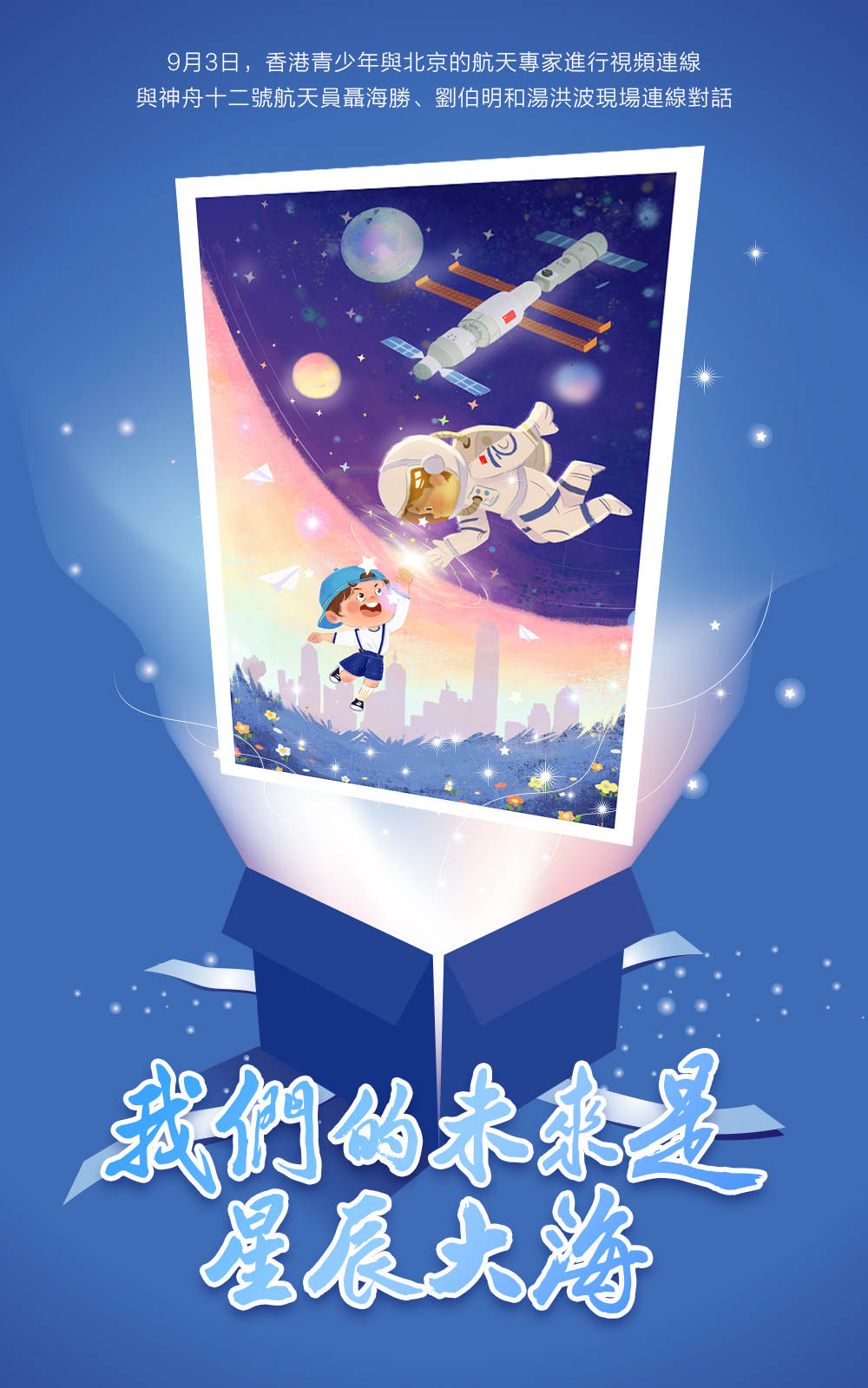 「香港呼叫神舟十二號」,9月3日一場激動人心的「天地對話」在天宮空間站和香港之間展開。「時代精神耀香江」之「仰望星空話天宮」活動中,香港青少年與北京的航天專家進行視頻連線,與身處「天宮」的航天員聶海勝、劉伯明和湯洪波現場連線對話,表達對太空的好奇與嚮往。