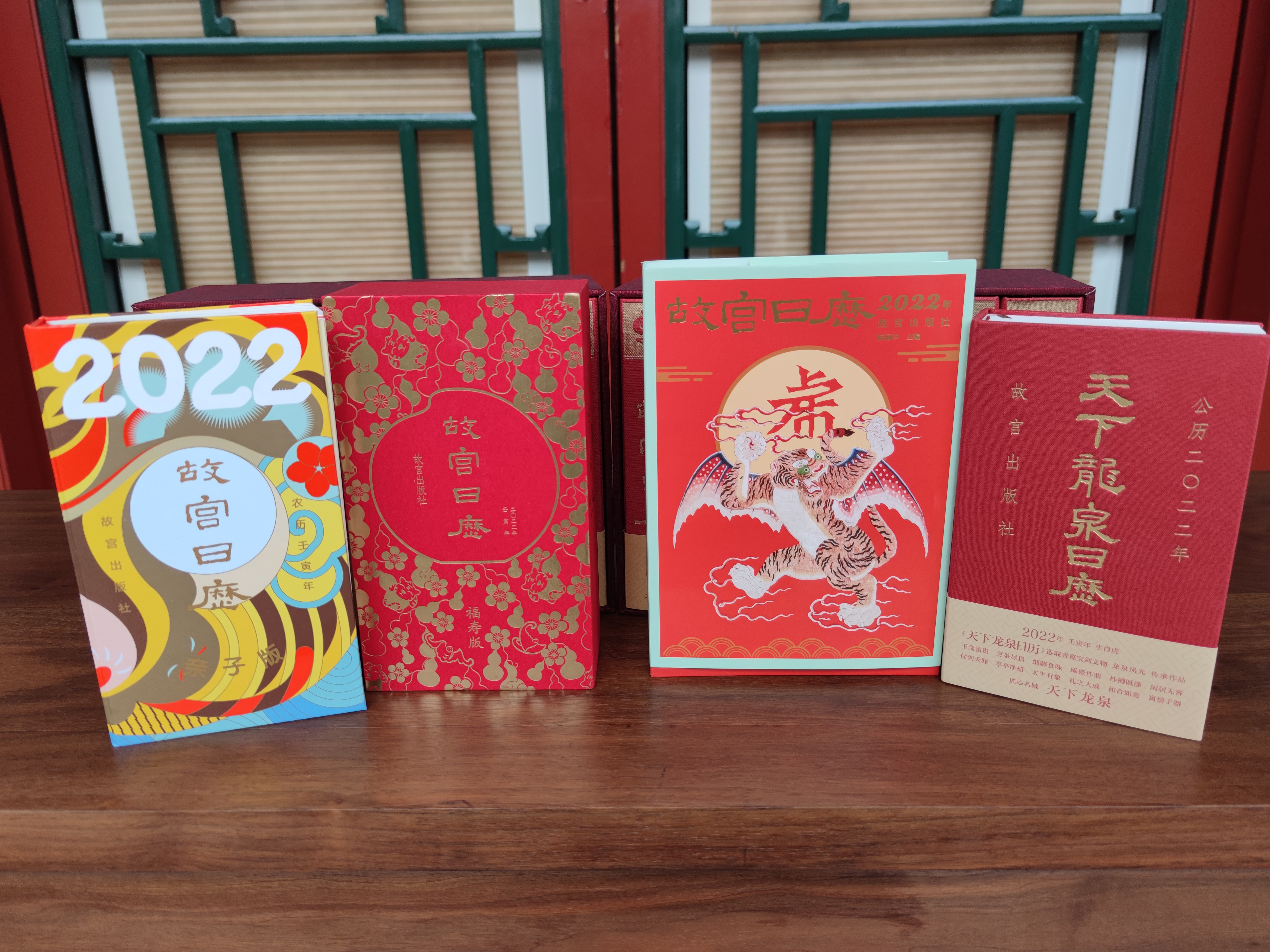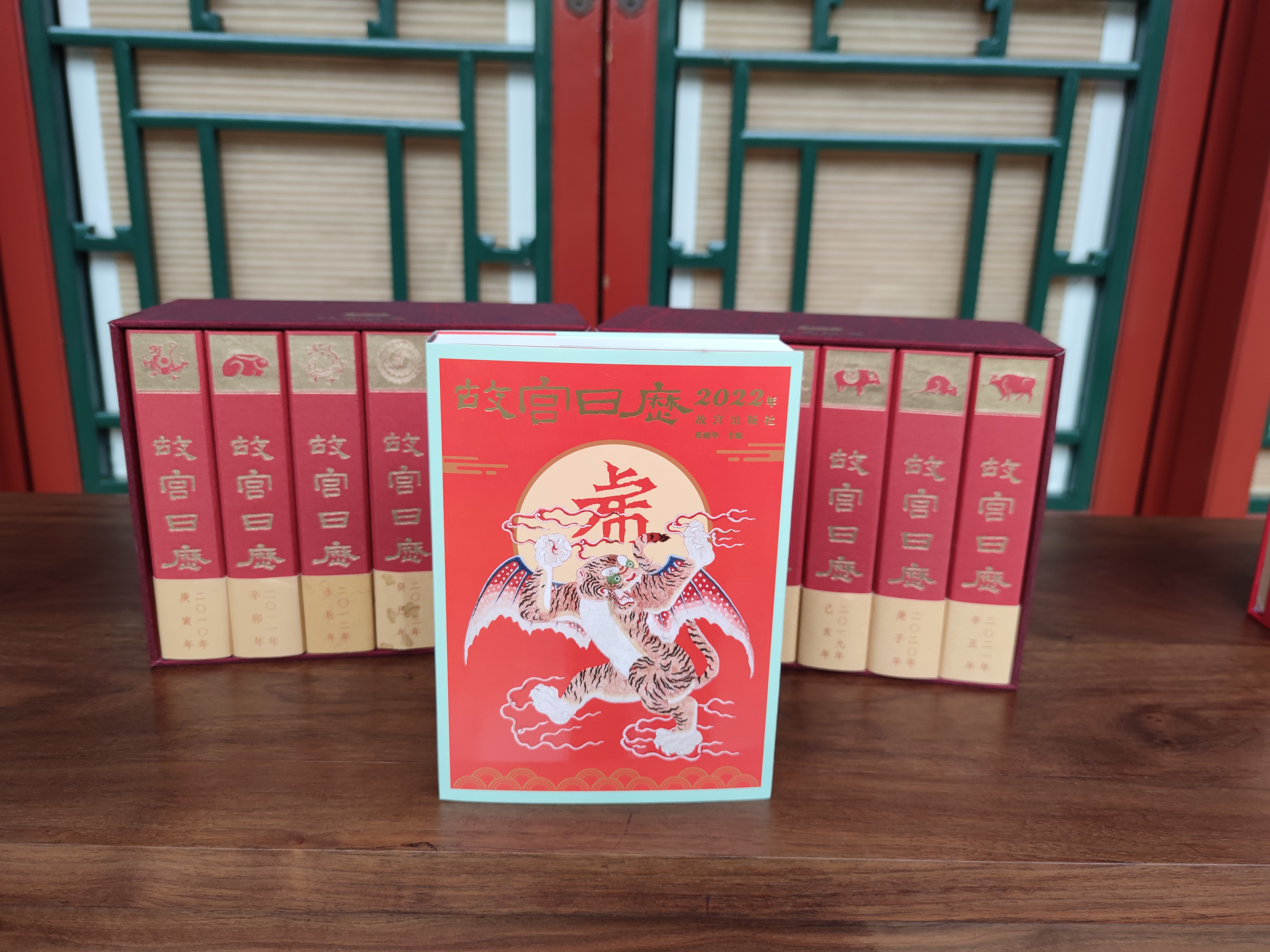2022年《故宮日曆》封面圖片採自故宮藏品「清代紅色紗綉雲紋飛虎旗」,為清宮戲劇機構昇平署所用旗類道具。「故宮日曆」四字仍然為碑拓集字,背景「虎」字為魏碑集字。日曆開本變大,文物圖片增大且高清,甚至還能從多角度展示文物。日期頁也留出了充足的空間讓讀者記事。