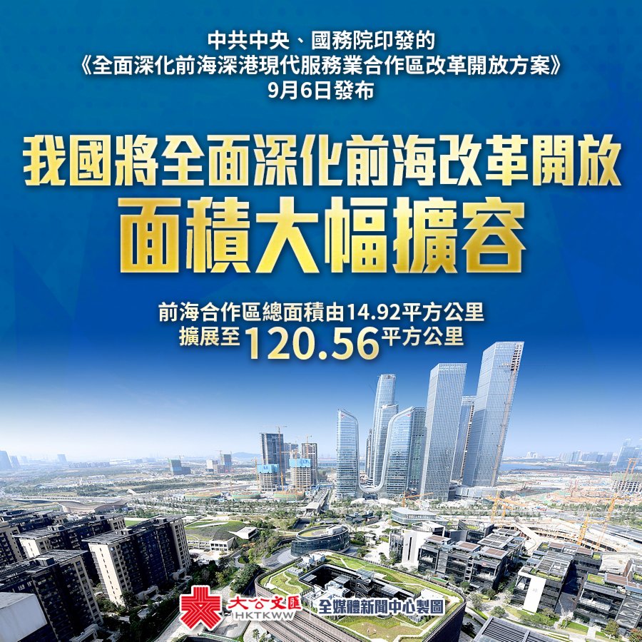 中央人民政府駐香港特別行政區聯絡辦公室發言人9月6日發表談話表示,中央今日公布《全面深化前海深港現代服務業合作區改革開放方案》,是全面深化前海深港現代服務業合作區改革開放、系統優化深港合作布局的重要舉措,也是支持香港經濟社會發展、豐富「一國兩制」實踐的重大戰略部署。方案為正處在由亂及治、由治及興關鍵時期的香港乘勢而上,找準「國家所需」和「香港所長」的交匯點,開闢了更為廣闊的舞台。