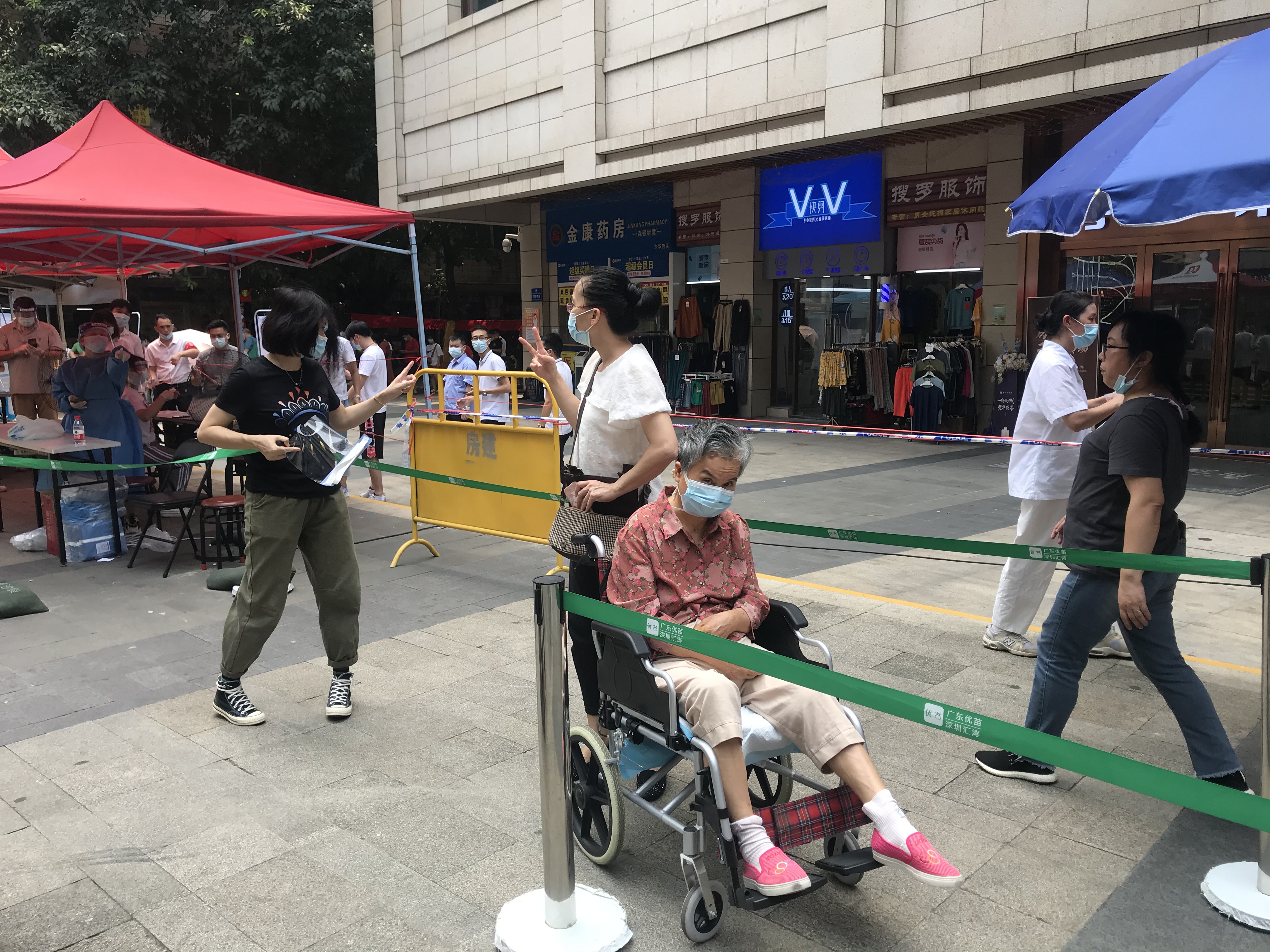 6日下午,大規模核酸篩查範圍擴大。記者在越秀區大東街看到,當地的新冠疫苗接種點已經改為核酸檢測點,社區工作人員不斷組織居民下樓進行檢測。由於當地居民老年人居多,高齡長者佔據一定比例,他們在家人和社區工作者的協助下來到檢測點採樣。