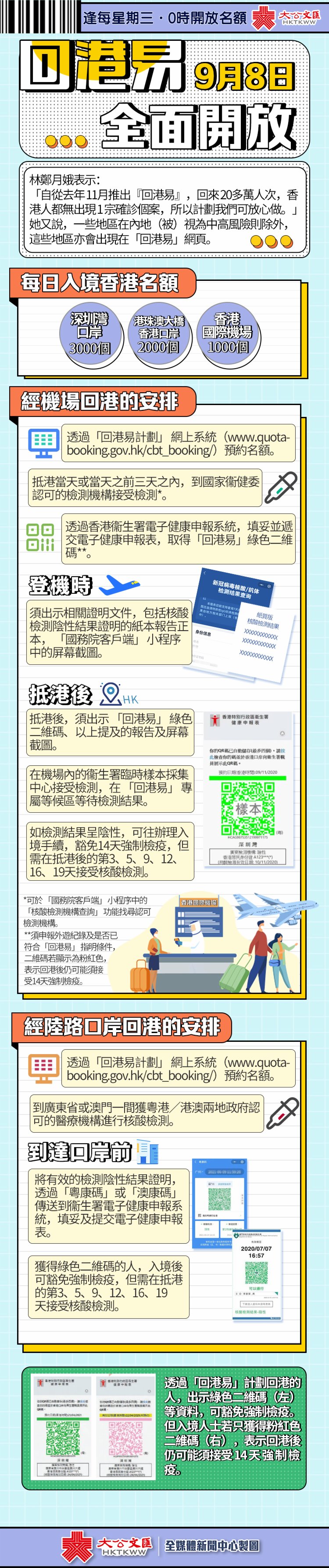 「回港易」計劃自去年11月推出,上月初因內地疫情反彈,實施範圍縮小至廣東省及澳門地區。林鄭月娥昨日出席行政會議前會見傳媒時表示,內地疫情已穩定,為方便香港居民回港,今日凌晨起「回港易」計劃全面恢復為內地全境及澳門。但在內地被視為中、高風險、並出現在本港「回港易」專頁上的小區除外。
