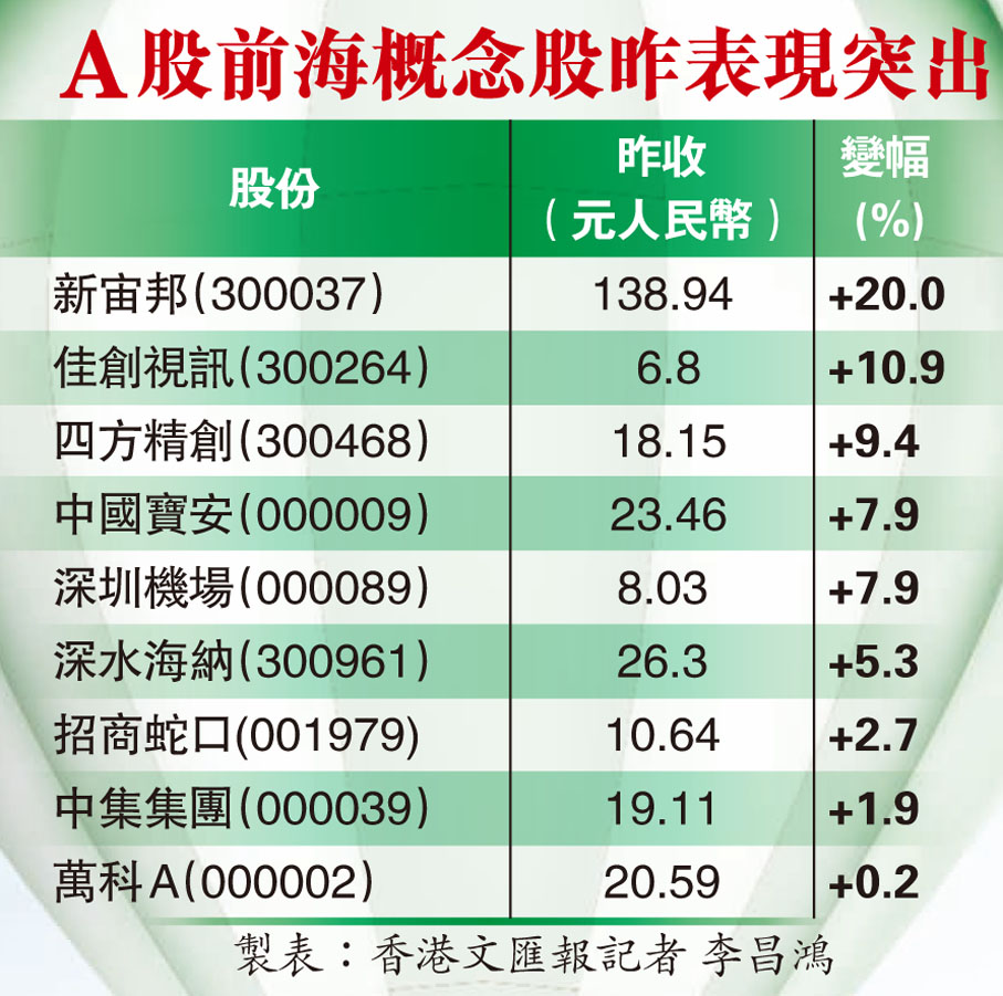 (香港文匯報記者 周紹基、馬翠媚)中央公布《全面深化前海深港現代服務業合作區改革開放方案》,有政商界人士表示,前海的規管可望進一步放寬,而前海也將會是大灣區開放政策的「試驗場」,有關方案可為香港的專業人才和企業提供巨大機遇,刺激起本港市場的活力;連同前日公布的橫琴粵澳深度合作區發展方案,市場亦重估上述相關地區的發展潛力。昨日粵港澳大灣區概念股炒起,澳門股有支持,而在該些地方擁有大量地皮的內房股同樣受惠,其中,深圳國際(0152)勁升9%表現最靚,部分深圳上市的A股亦漲停板。