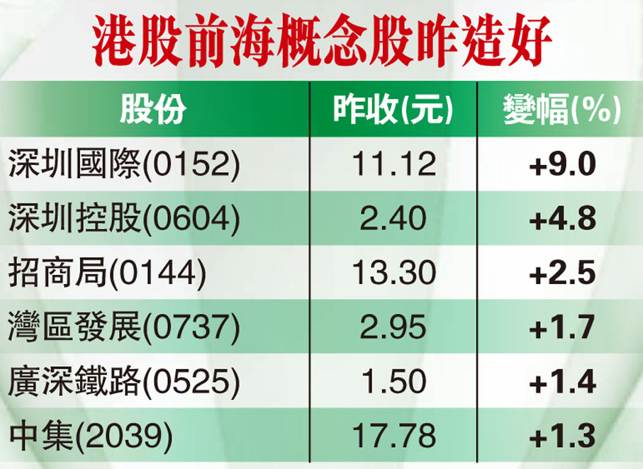 受近期內地密集的改革政策刺激,繼日前橫琴 / 澳門概念股炒起,昨日輪到前海 / 深圳概念股大升。深圳國際全日抽升9%報11.12元,深圳控股(0604)亦曾升逾6.6%;澳門概念股方面,澳博(0880)及永利澳門(1128)升逾3%,其他濠賭股也普遍向上。由於前海發展區主力為金融業,市場憧憬對內地股市發展有幫助,中資券商股同樣近全線向好。一些深圳上市的A股昨日更曾經漲停板,當中包括深水規院,而深圳機場在漲停後略見回軟。港股再升190點,收報26,353點,成交1,451億元。