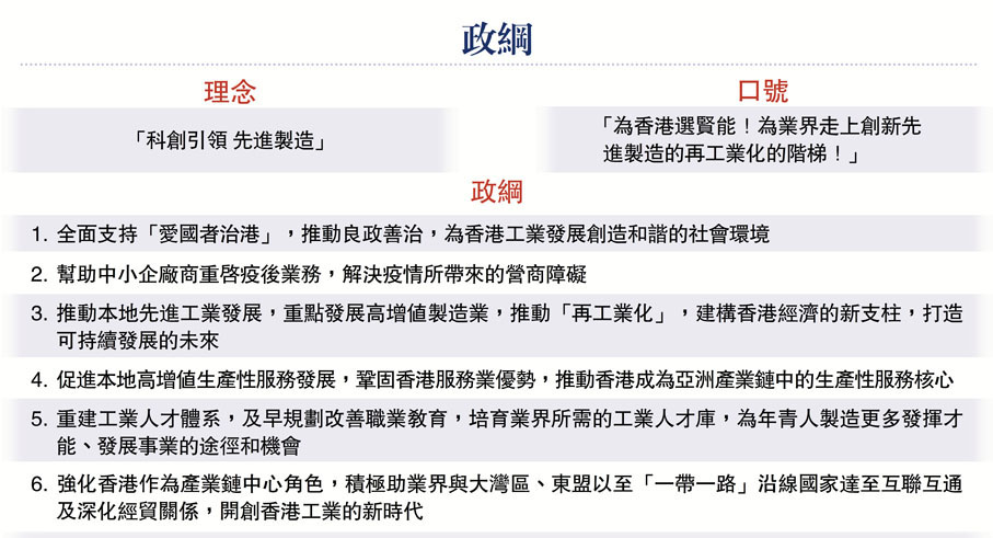 (香港文匯報記者 藍松山)香港產業要升級再轉型,「工業4.0」是其中一個重點。2021年選舉委員會工業界(第一)界別分組有17名候選人自動當選,其中5人昨日接受香港文匯報專訪時表示,他們會以「科創引領、先進製造」為選舉理念,以「為香港選賢能!為業界走上創新先進製造的再工業化的階梯!」為口號,帶領香港工業界融入國家發展大局,把握國家「十四五」規劃及粵港澳大灣區發展機遇,推動良政善治,為香港建構穩定的營商環境,讓「一國兩制」行穩致遠。