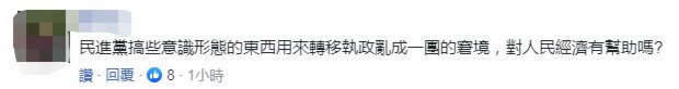 另有網友怒斥,「錢太多無處花?民進黨都『執政』多久了還在搞意識形態!」更有網友質疑,「民進黨搞些意識形態的東西用來轉移執政亂成一團的窘境,對人民經濟有幫助嗎?」