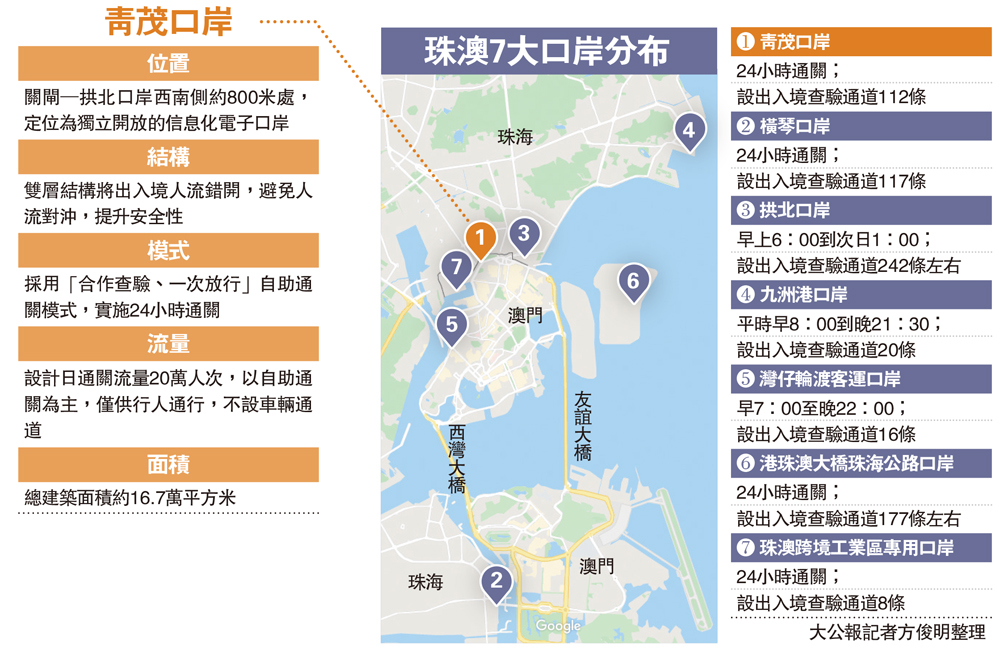 青茂口岸8日啟用,成為珠海和澳門之間啟用的第7個旅檢口岸。截至目前,珠澳之間已設有拱北、橫琴、灣仔、跨境工業區、港珠澳大橋、九洲港及青茂7個旅檢口岸,這促進了橫琴「粵澳深度合作區」、粵港澳大灣區的建設。其中拱北、橫琴、跨境工業區、港珠澳大橋及青茂5個為陸路口岸,灣仔及九洲港2個為水路口岸。