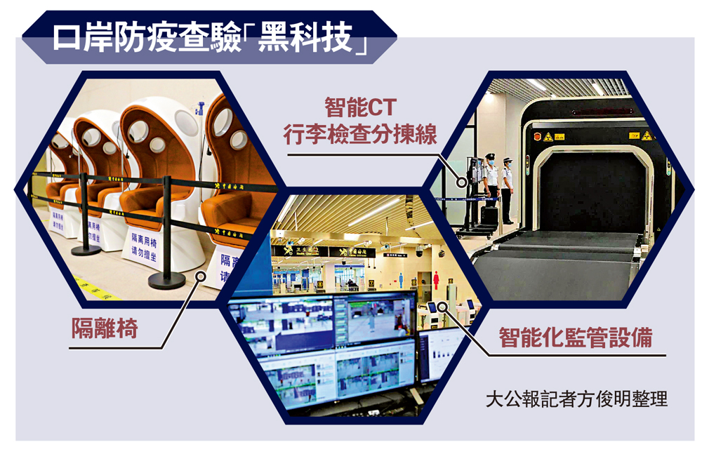在新啟用的青茂口岸,各類查驗與防疫「黑科技」亮相,涵蓋紅外測溫儀、智能CT行李檢查分揀線等海關智能化監管設備,以及專設的隔離椅和負壓隔離單元,為安全通關保駕護航。