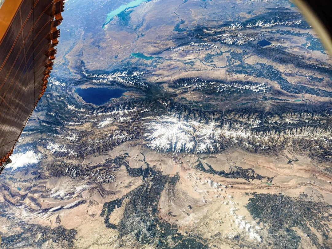 此外,在新疆克孜勒蘇柯爾克孜自治州上空,劉伯明拍下「大西洋最後一滴眼淚」賽里木湖的全景。天山山脈上,來自大西洋的水汽最終在此停下腳步,凝結成冰川,融化為涓涓流水,滋養天山以南,塔里木盆地裡的戈壁沙漠。