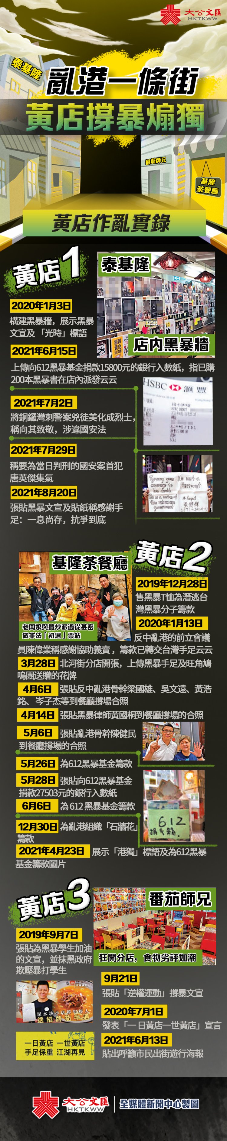 大公文匯全媒體報道,前年黑暴期間,深水埗基隆街一帶出現多間食人血饅頭、藉煽暴撐「獨」招生意的「黃色食店」。有黃店老闆聲稱全靠「黃色經濟圈」(黃圈)令瀕臨倒閉的店舖起死回生。國安法實施一年多以來,這些黃店仍然長期在社交媒體展示「港獨」標語和文宣,荼毒市民,更公然為黑暴基金籌款,無視法紀。