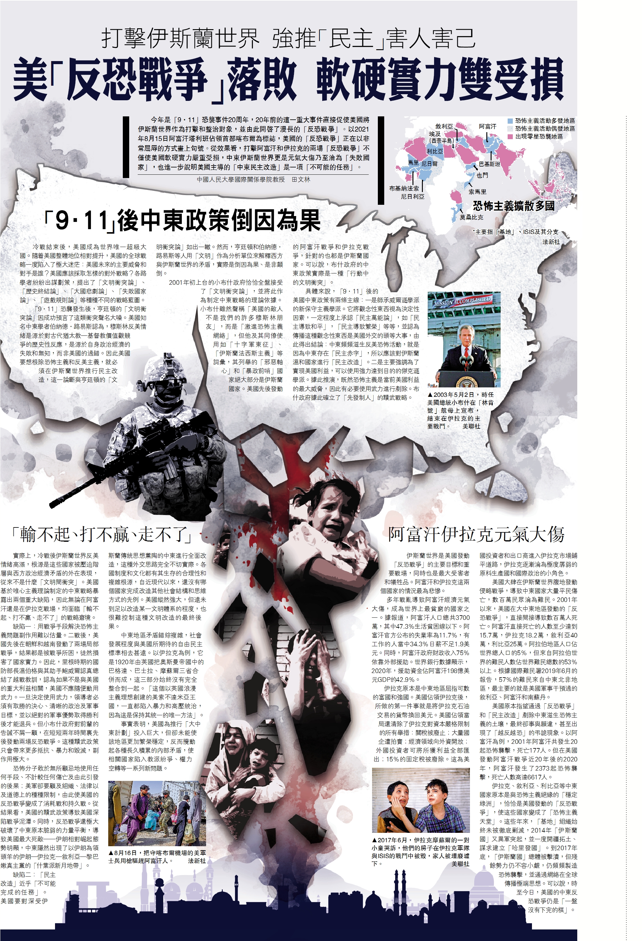 今年是「9·11」恐襲事件20周年,20年前的這一重大事件直接促使美國將伊斯蘭世界作為打擊和整治對象,並由此開啟了漫長的「反恐戰爭」。以2021年8月15日阿富汗塔利班佔領首都喀布爾為標誌,美國的「反恐戰爭」正在以非常屈辱的方式畫上句號。從效果看,打擊阿富汗和伊拉克的兩場「反恐戰爭」不僅使美國軟硬實力嚴重受損,中東伊斯蘭世界更是元氣大傷乃至淪為「失敗國家」,也進一步說明美國主導的「中東民主改造」是一項「不可能的任務」。