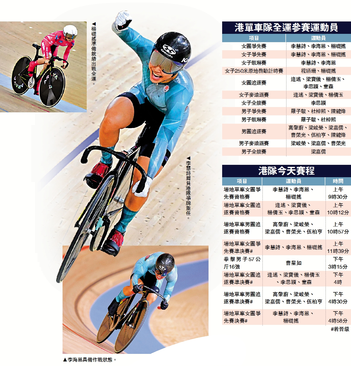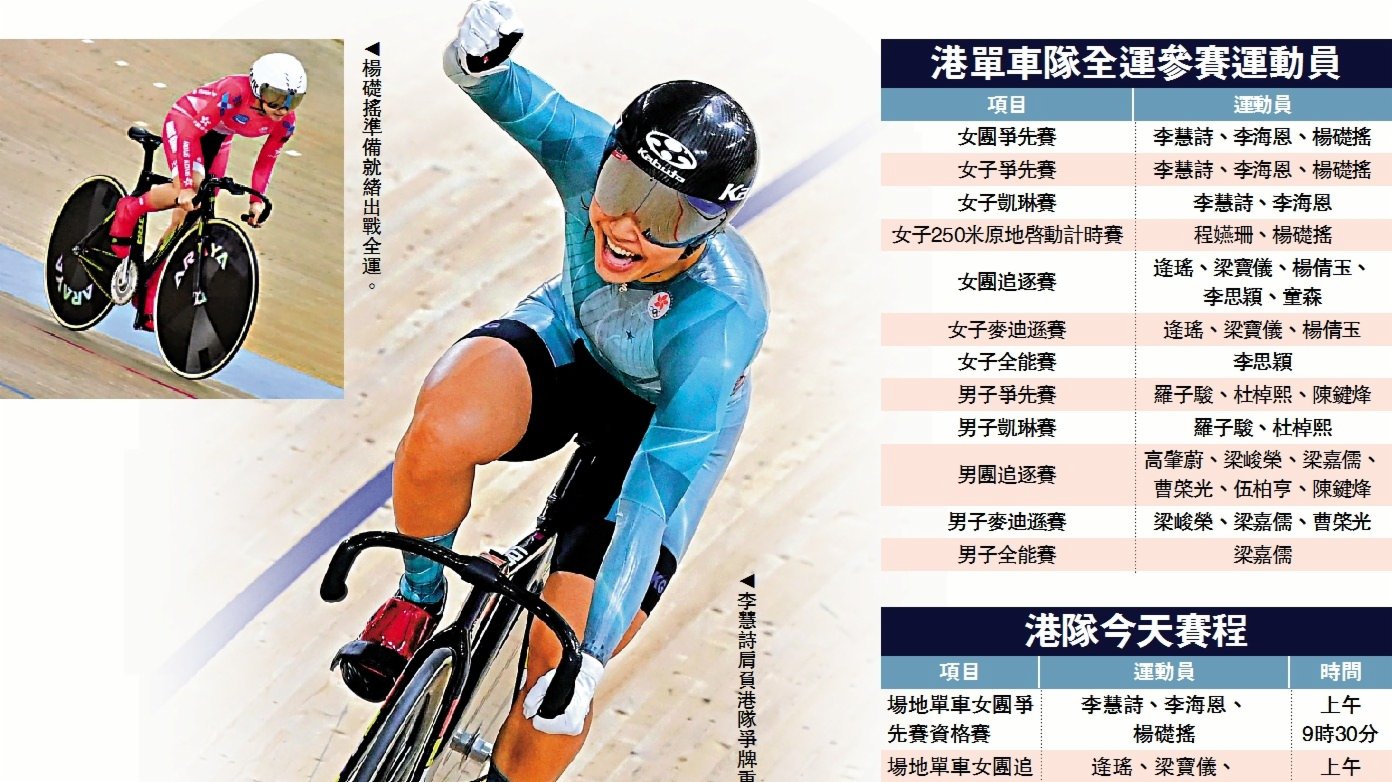 (大公報記者 張銳)全運會場地單車賽今天在河南省洛陽市體育中心單車館開賽,在東京奧運會奪得女子爭先賽銅牌的香港「牛下女車神」李慧詩將會登場,搭檔李海恩和楊礎搖出戰女子團體爭先賽,爭奪獎牌。3名港隊女將於今早9時30分參加資格賽,力爭晉級準決賽和決賽。