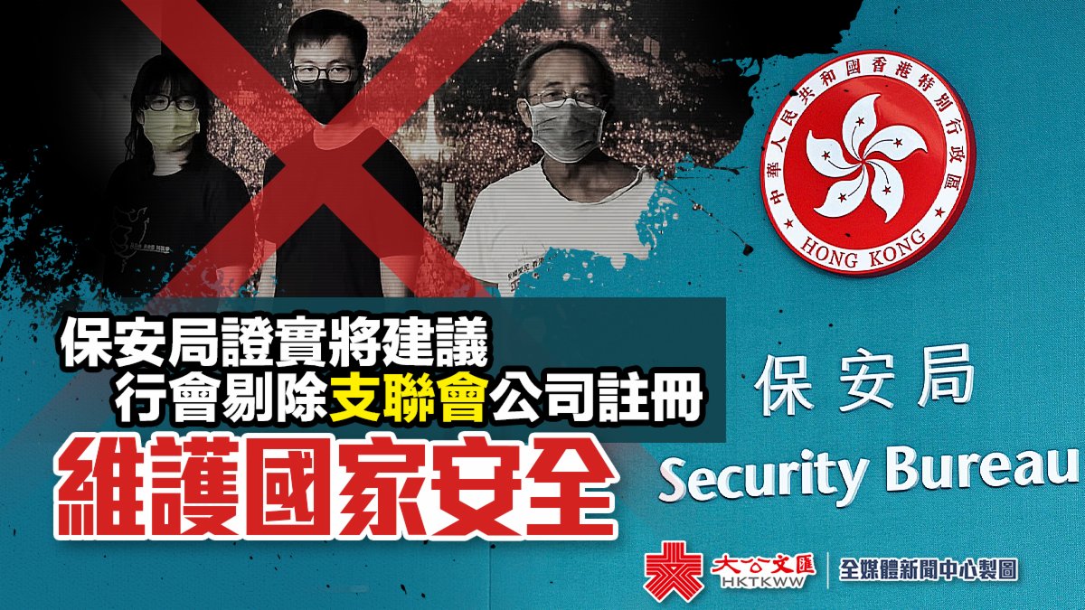 大公文匯全媒體報道,保安局今日(10日)回覆傳媒查詢時證實,局長鄧炳強將向行政長官會同行政會議建議,行使《公司(清盤及雜項條文)條例》第360C條下的權力,命令公司註冊處處長將支聯會自公司登記冊中剔除。