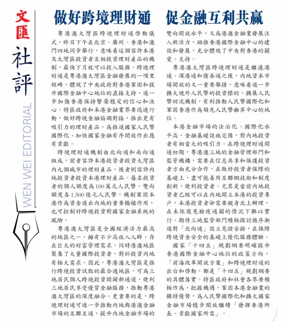 粵港澳大灣區跨境理財通啟動儀式,昨日下午在北京、廣州、香港和澳門四地同步舉行,意味着這個容許本港及大灣區投資者互相投資理財產品的機制,最快下月就可以投入服務。跨境理財通是粵港澳大灣區金融發展的一項里程碑,體現了中央政府對香港鞏固和提升國際金融中心地位的直接支持,進一步加強香港保持繁榮穩定的信心和決心。特區政府和本港金融業界要迅速行動,做好跨境金融協調對接,推出更有吸引力的理財產品,為推進國家人民幣國際化、加快國家金融有序開放作出應有貢獻。