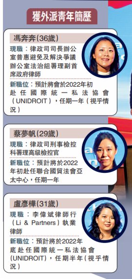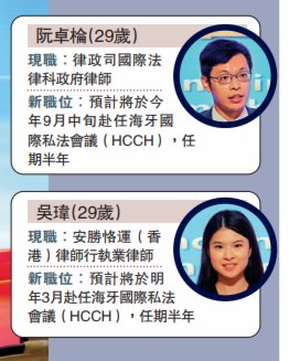 此次經過遴選,律政司國際法律科政府律師阮卓棆與安勝恪運(香港)律師行執業律師吳瑋一起,借調往海牙國際私法會議工作,任期半年;普惠避免及解決爭議辦公室法治組署理副首席政府律師馮奔奔,以及李偉斌律師行(Li & Partners)執業律師盧彥樺借調往國際統一私法協會工作,任期一年;律政司刑事檢控科署理高級檢控官蔡夢帆則借調聯合國貿法會亞太中心任職,任期一年。