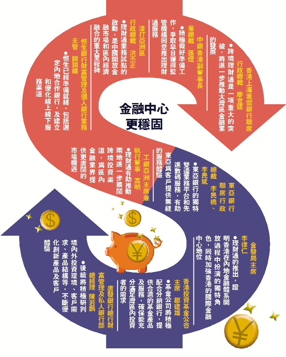 為搶佔理財通市場,本港零售銀行積極做好準備。以本港三家發鈔行為例,滙豐表示在大灣區有超過5000名零售銀行員工,隨時準備為客戶提供無縫跨境理財服務,並計劃在理財通啟動初期提供超過100項中、低風險的理財產品,涵蓋細則中規定的所有產品種類。