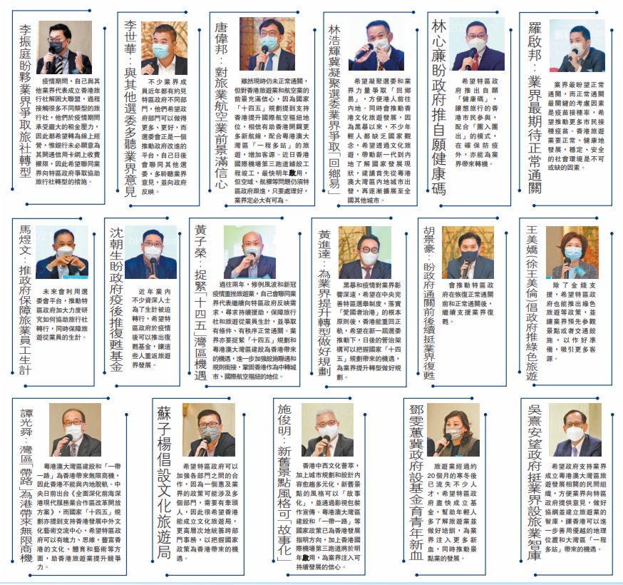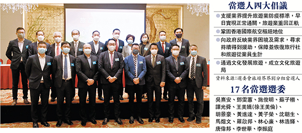 (香港文匯報記者 鄭治祖)新選舉制度下,屬於選舉委員會第一界別的旅遊界界別分組共有17席,17名早前參選的業界代表已自動當選。該17名選委當選人共同舉辦業界交流會,分別在會上介紹其參選政綱,並即場回答業界團體的提問。當選人共同提出四大倡議,圍繞盡早恢復正常通關、鞏固香港國際航空樞紐地位、為業界從業員提供持續援助,及成立文化旅遊局等方面。他們又指,會推動業界善用「十四五」規劃和「一帶一路」等國家政策帶來的機遇,讓香港進一步融入國家發展大局。