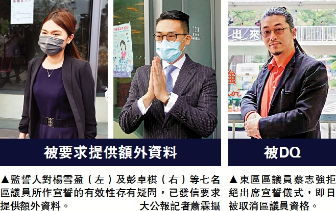 監誓人對七名區議員所作宣誓的有效性存有疑問,已發信要求提供額外資料,以決定宣誓是否有效,當中包括楊雪盈、梁柏堅、韋少力、蘇逸恒、陳榮泰、黎梓欣及彭卓棋。