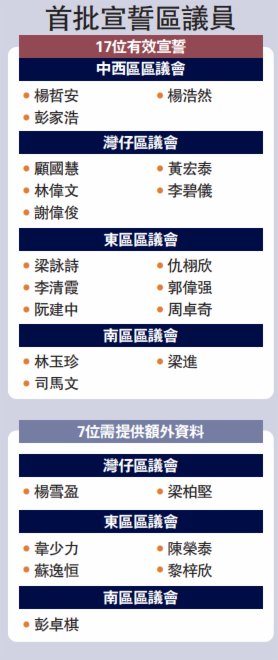 政府於昨日晚上公布,根據基本法第104條的解釋所訂下的原則及相關的法律規定,監誓人對以下區議員今日所作宣誓的有效性存有疑問,因此已向有關區議員發信要求提供額外資料,以決定其宣誓是否有效,包括灣仔區議會的楊雪盈與梁柏堅;東區區議會的韋少力、蘇逸恒、陳榮泰、黎梓欣;南區區議會的彭卓棋。