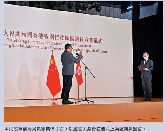 宣誓儀式於香港北角社區會堂舉行,民政事務局局長徐英偉作為行政長官授權的監誓人監誓。宣誓儀式完畢後,徐英偉表示,當天有一名區議員沒有出席宣誓儀式,根據《宣誓及聲明條例》第20A章,該名東區區議員蔡志強須離任,不會安排重新宣誓。徐英偉指出,如監誓人對部分議員宣誓的有效性存在疑問,亦會作出跟進。當中涉及違法的行為,會把個案轉交給執法部門跟進;其餘三場包括九龍及新界區議員的宣誓儀式,也會盡快落實。