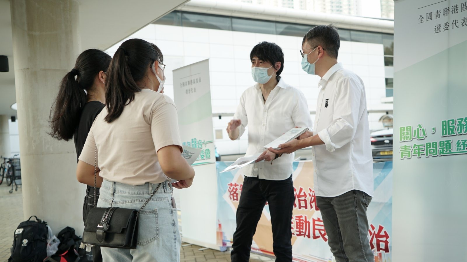 大公文匯網報道,9月11日下午,全國青聯港區委員選委代表詹勝和黃子文,來到東涌的士站,為市民講解「推動良政善治,愛國者治港」,「青年聲音帶進選委會」和「關心,服務及為青年問題舒緩解壓」等議題。