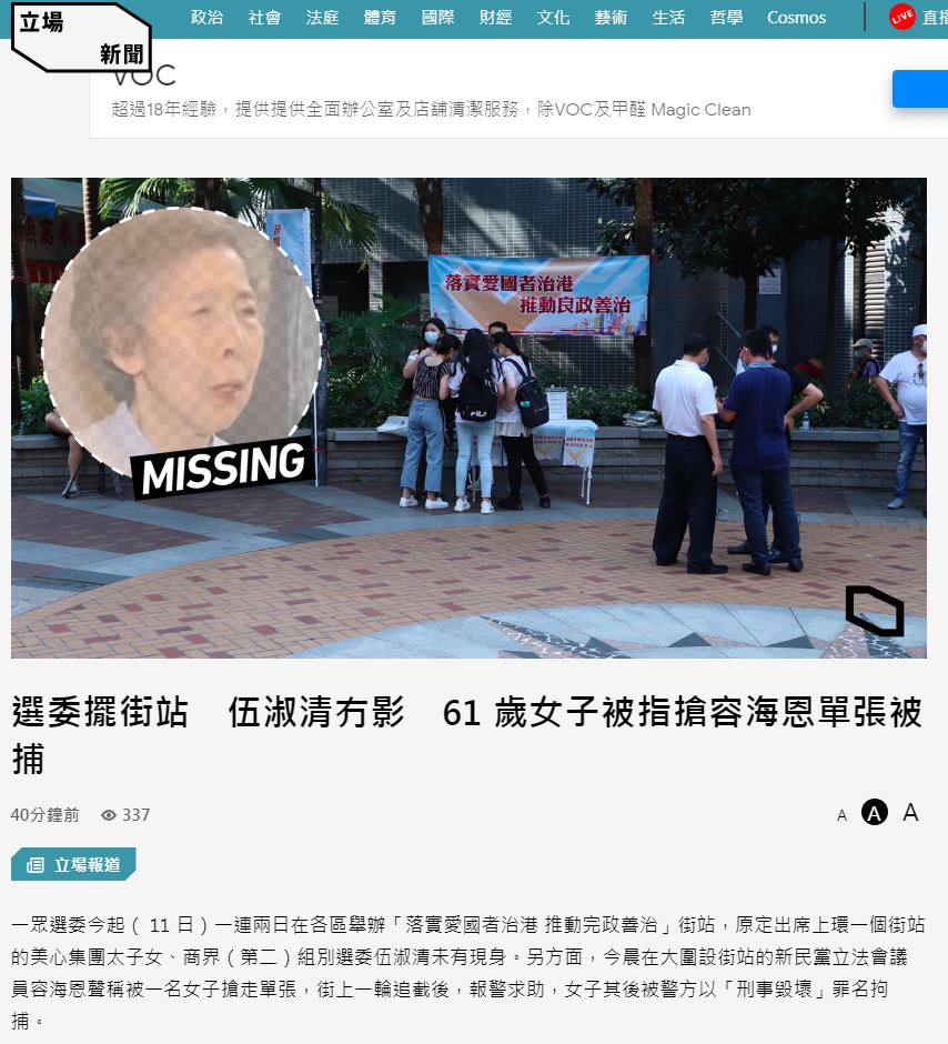 大公文匯全媒體報道,「落實愛國者治港,推動良政善治」街站宣傳活動今日(11日)啟動,多個界別分組近千名當然選委和自動當選的選委響應,今(11日)明兩日在各區將設超過1000個街站。《立場新聞》今晚刊登一則假新聞指商界(第二)組別選委伍淑清未曾現身街站工作,宣介新選制。