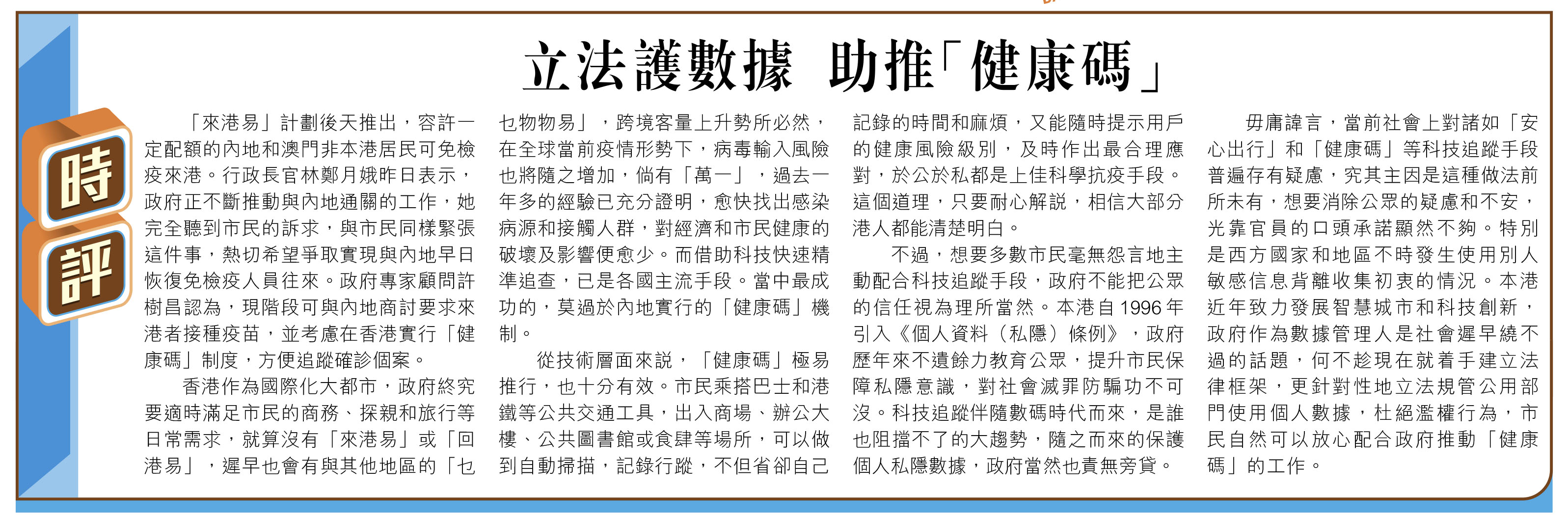 毋庸諱言,當前社會上對諸如「安心出行」和「健康碼」等科技追蹤手段普遍存有疑慮,究其主因是這種做法前所未有,想要消除公眾的疑慮和不安,光靠官員的口頭承諾顯然不夠。特別是西方國家和地區不時發生使用別人敏感信息背離收集初衷的情況。本港近年致力發展智慧城市和科技創新,政府作為數據管理人是社會遲早繞不過的話題,何不趁現在就着手建立法律框架,更針對性地立法規管公用部門使用個人數據,杜絕濫權行為,市民自然可以放心配合政府推動「健康碼」的工作。