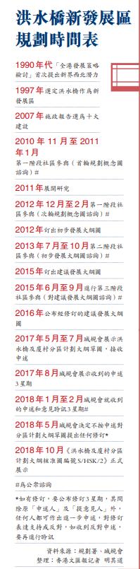 翻查規劃署及城規會資料,洪水橋/廈村新發區由首次提出到走完整個規劃程序耗時近30年,最後8年程序一直在諮詢、規劃、再諮詢、再規劃的過程中打滾。民建聯立法會議員劉國勳日前接受香港文匯報訪問時直言,該項目花8年進行五輪公眾諮詢,顯然是過多,他認為第一階段社區參與,即首輪、次輪規劃概念圖諮詢就可以省卻:「規劃概念圖太抽象,你睇吓洪水橋規劃,佢2010年11月舉行首輪諮詢,那時連研究都未做(翌年才展開研究),這一兩年諮詢係浪費時間。」