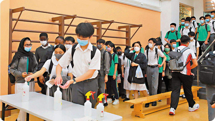 昨日上午,地利亞修女紀念學校(協和)學生在校園量度體溫後,魚貫進入禮堂用酒精搓手液消毒,一切程序有序進行。校長林艷玲表示,該校一開學即收集學生接種疫苗的數據,發現中六生接種率已達標,為顧及學習進度,遂向教育局申請中六級在昨日率先復課。該校昨日全校上午維持統一時間表,而中六生則在校內或校外午膳後,下午再回校上課約1.5小時。