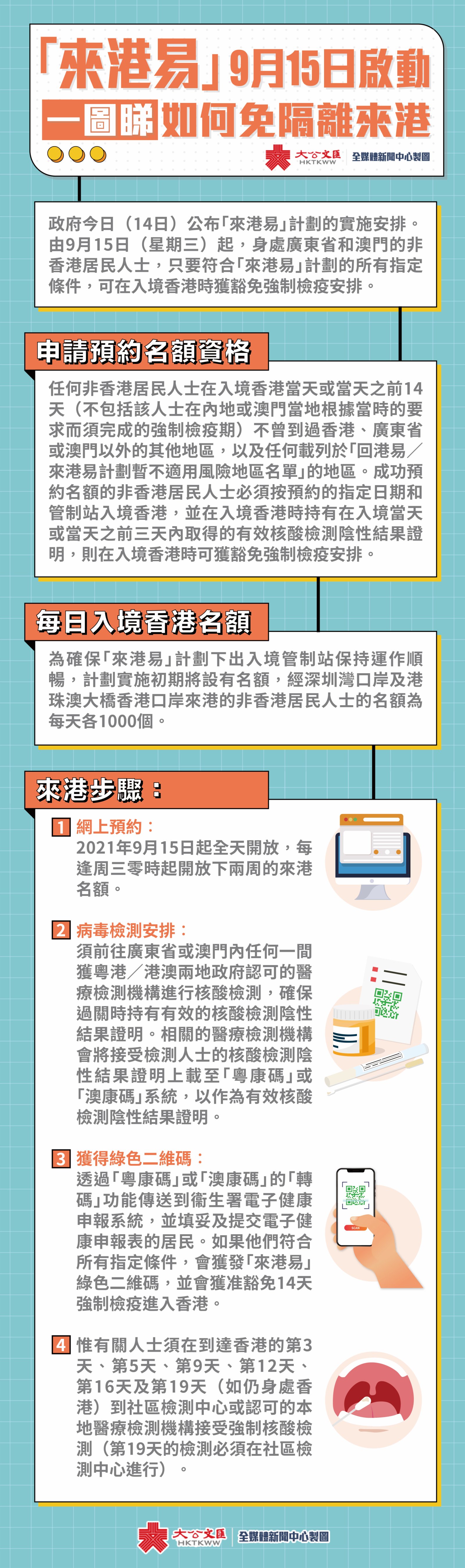 大公文匯全媒體報道,政府今日(14日)公布「來港易」計劃的實施安排。由明日(9月15日)起,身處廣東省和澳門的非香港居民人士,只要符合「來港易」計劃的所有指定條件,可在入境香港時獲豁免強制檢疫安排。廣東和澳門的居民如何利用「來港易」計劃來香港免隔離?快來一圖睇清!