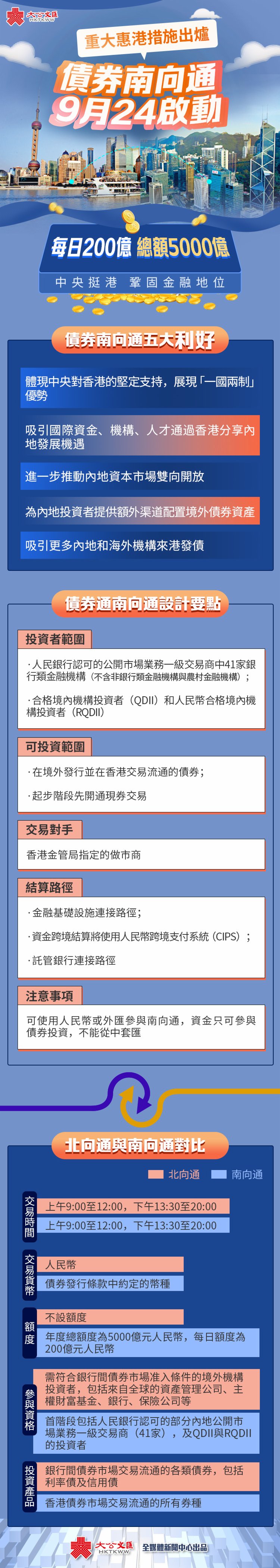 人民銀行與金管局昨日聯合發布債券南向通細則。首階段參與南向通的機構投資者,包括人行公開市場業務一級交易商中的41家銀行、合格境內機構投資者(QDII)及人民幣合格境內機構投資者(RQDII),未來將循序漸進擴大合資格投資者範圍。投資產品方面,參照北向通安排,南向通初期先開通現券交易,標的債券涵蓋香港市場買賣的所有境外發行債券,交易對手為金管局指定做市商。