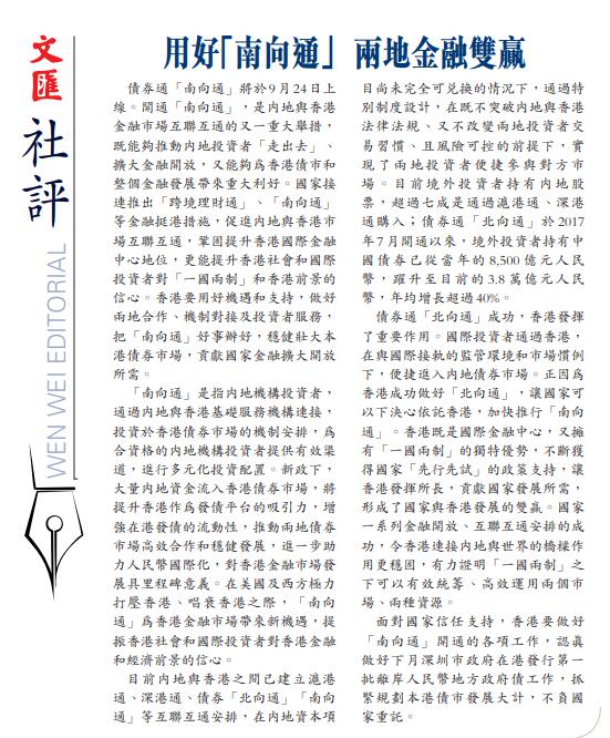 債券通「南向通」將於9月24日上線。開通「南向通」,是內地與香港金融市場互聯互通的又一重大舉措,既能夠推動內地投資者「走出去」、擴大金融開放,又能夠為香港債市和整個金融發展帶來重大利好。國家接連推出「跨境理財通」、「南向通」等金融挺港措施,促進內地與香港市場互聯互通,鞏固提升香港國際金融中心地位,更能提升香港社會和國際投資者對「一國兩制」和香港前景的信心。香港要用好機遇和支持,做好兩地合作、機制對接及投資者服務,把「南向通」好事辦好,穩健壯大本港債券市場,貢獻國家金融擴大開放所需。