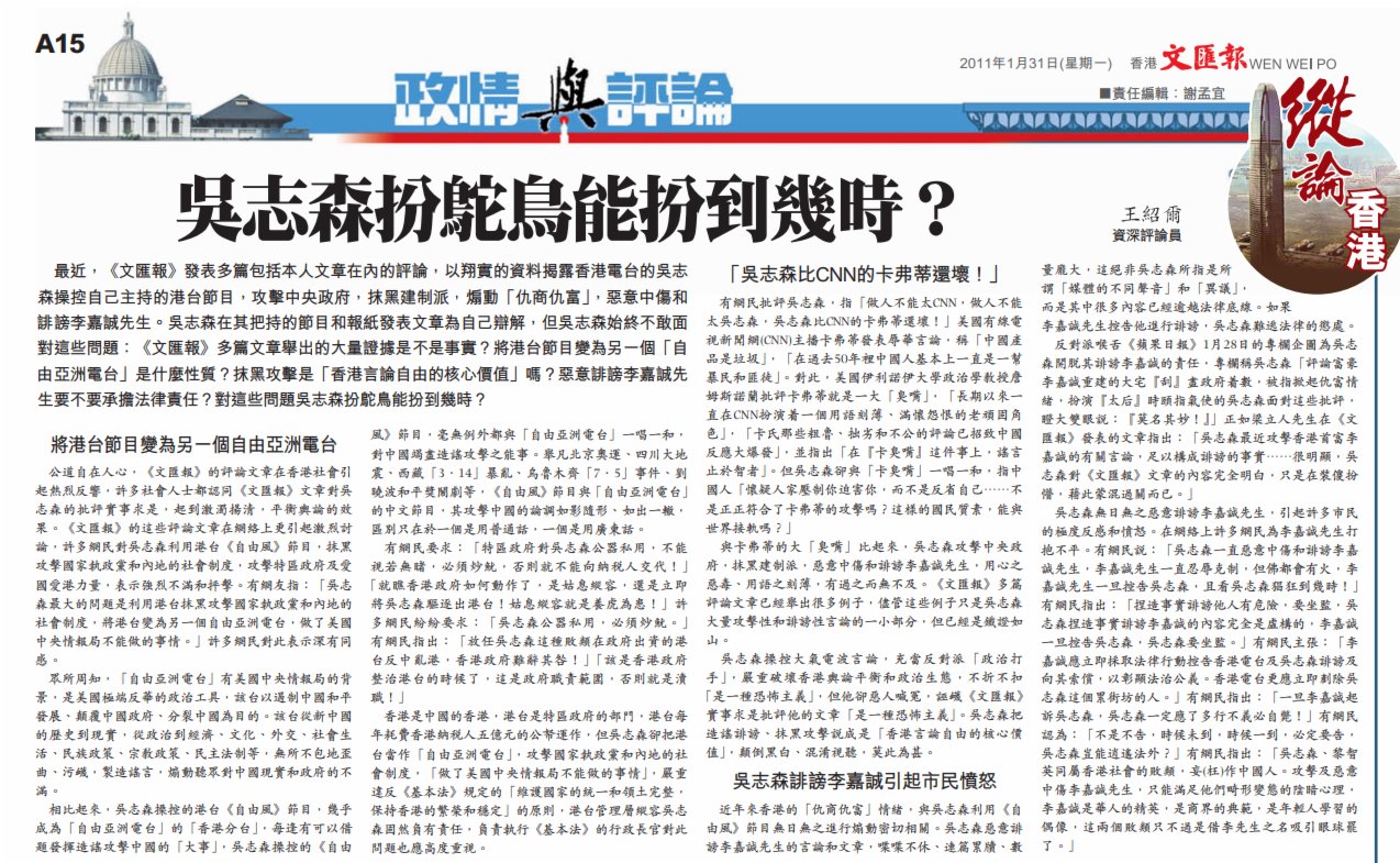 早在2011年吳志森就被《香港文匯報》點過名