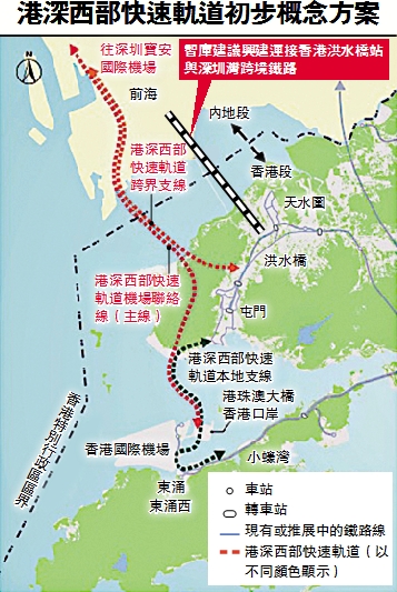 翻查《鐵路發展策略2014》,當時政府已曾研究興建「港深西部快速軌道」,當時概念分三個部分,除前海連接洪水橋的路線外,更包括連接香港國際機場至深圳寶安國際機場,以及屯門南接駁小蠔灣支線,預計成本會超過1100億元,當局形容經濟效益仍有待驗證。