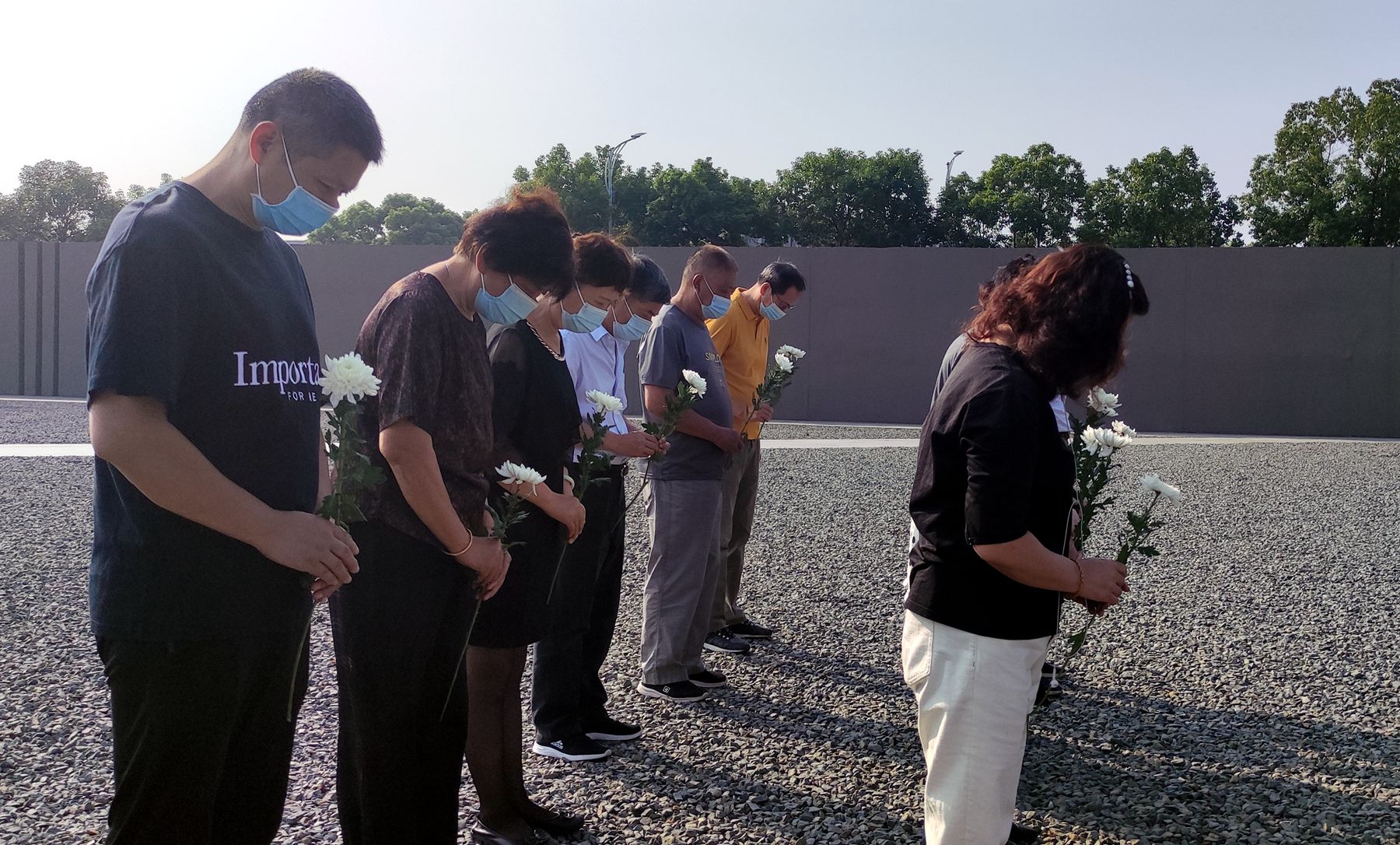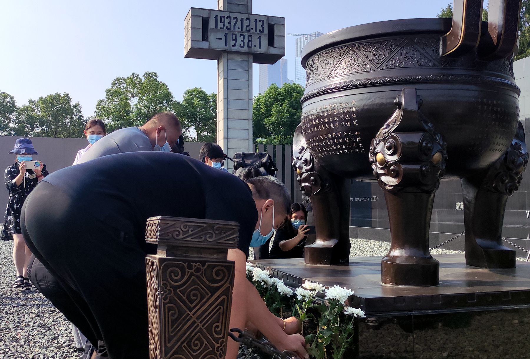 上午10時,凄厲的防空警報響徹南京上空,人們駐足肅立默哀。紀念館內,前來參觀的遊客默默地為南京大屠殺死難者獻上獻花,表達哀思之情。