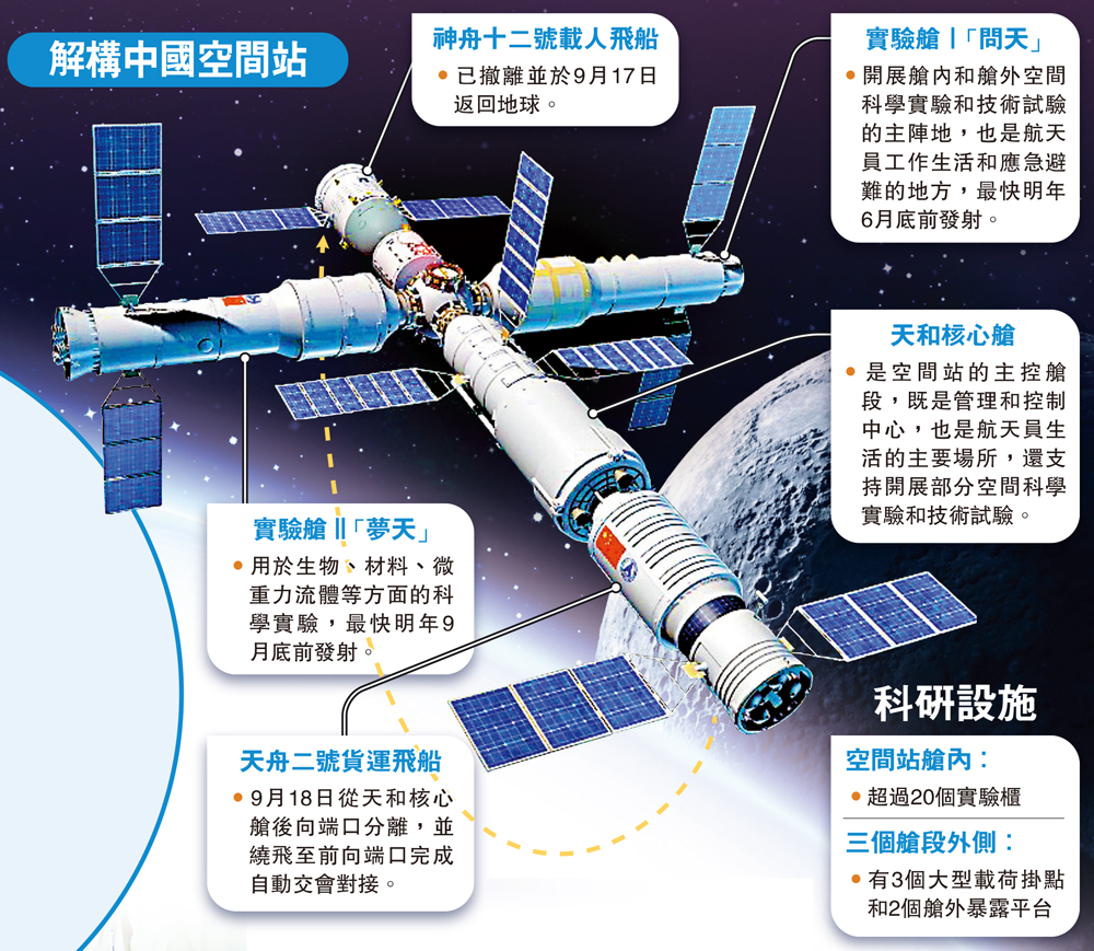 (大公報記者 劉凝哲)9月18日10時25分,天舟二號貨運飛船從空間站天和核心艙後向端口分離,並繞飛至前向端口完成自動交會對接,整個過程歷時約4小時。目前,空間站天和核心艙與天舟二號貨運飛船組合體狀態良好,後續將先後迎接天舟三號貨運飛船、神舟十三號載人飛船的訪問。中國載人航天工程空間應用系統總指揮、中國科學院空間應用工程與技術中心主任高銘日前表示,科學家未來將進入中國空間站工作。目前,中國已選拔4位具有不同學科背景的載荷專家,正在航天員中心接受訓練,會在空間站進入運營階段之後陸續開始工作,科研天地協同快將實現。