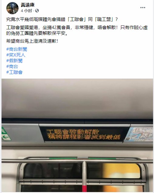 黃遠康嚴正批評:究竟水平幾低嘅媒體先會搞錯「工聯會」同「職工盟」?工聯會愛國愛港,坐擁42萬會員,非常穩健。希望商台馬上澄清及道歉!