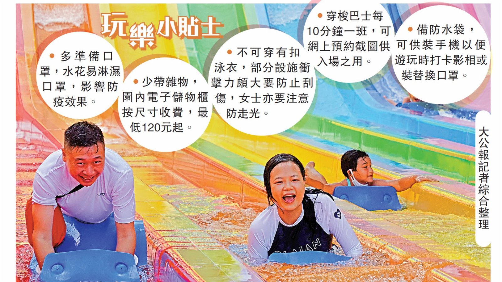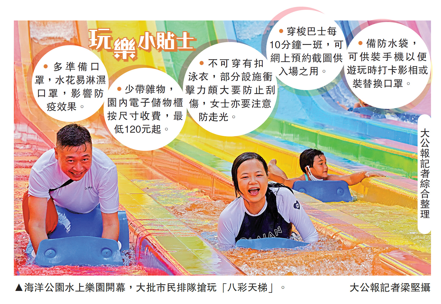 (大公報記者 解雪薇)海洋公園水上樂園昨日正式開放迎客,正值中秋佳節,不少市民攜全家「上陣」。早上10時開閘前,已有逾百人在公園外排隊等候,有小朋友說期待已久。場內氣氛熱烈,必玩設施「八彩天梯」一帶更是尖叫聲連連,有公園粉絲大呼好玩,笑說長時間排隊「都好抵」。由於場內規定下水遊玩前要戴口罩,現場水花四濺,有遊客帶備多個口罩。