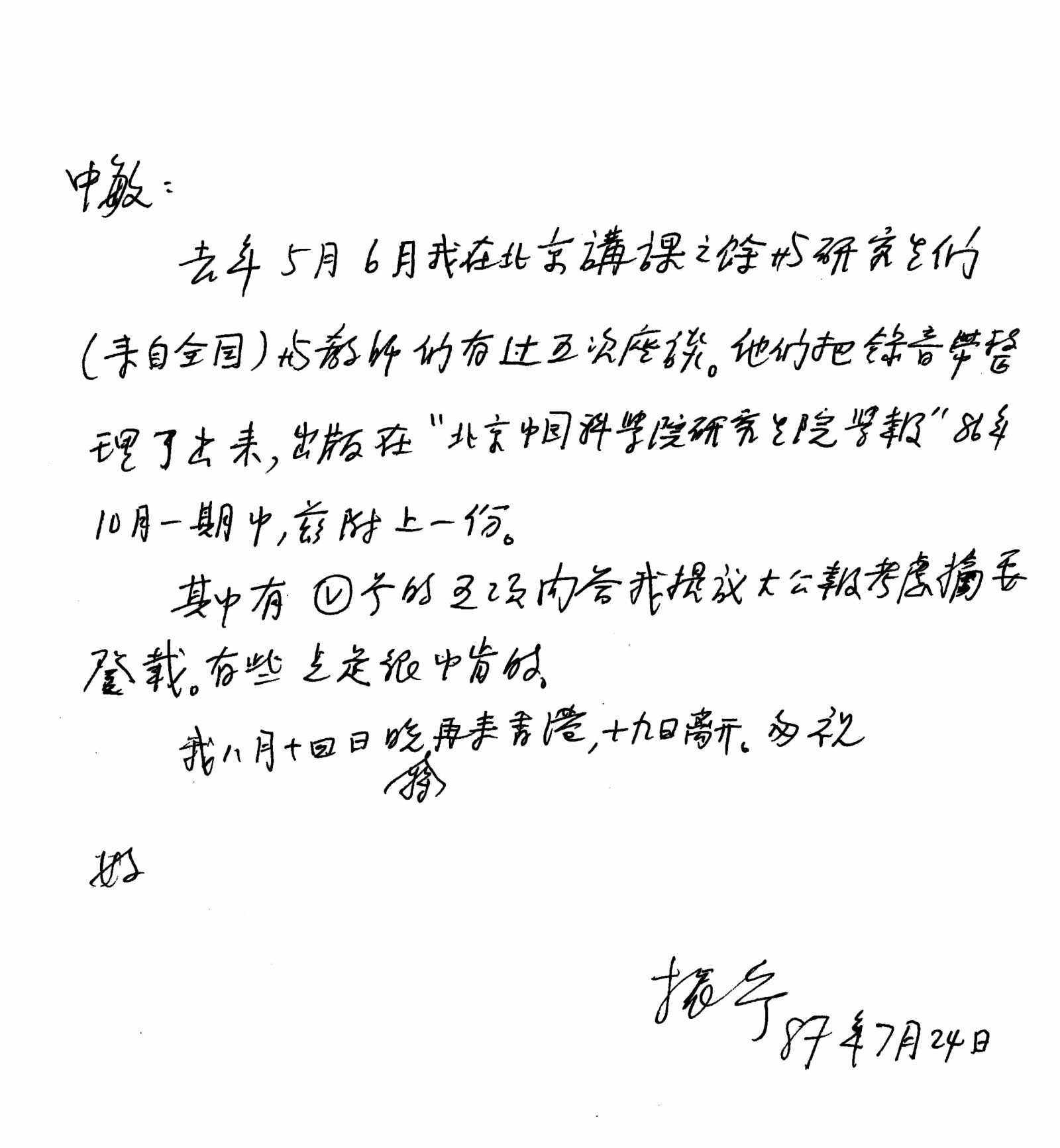 楊振寧在最後進行了一段長約十分鐘的致辭:「50年前,1971年,我第一次訪問新中國,這個訪問是我人生中非常重要的一段(經歷)。因為使得我對新中國第一次有了一點認識,這個認識對於以後50年我的人生軌跡有非常大影響。」楊振寧說。那次的訪問,他除了看望在醫院的父親以外,還見了一些親戚和朋友,「其中最重要的、也是我最親近的朋友,就是鄧稼先。」楊振寧提到,在他訪問中國期間,鄧稼先曾給他寫過一封信,這封信前不久出版在楊振寧的一本新書中。這封信不僅驗證了中國原子彈的製造基本沒有外國人參與,在信的最尾,還有幾段話,是鄧稼先給楊振寧的一個期望:但願人長久,千里共同途。「當時我沒看懂這句話。最近我又將這封信仔細看了,我覺得今天,50年以後,我可以跟鄧稼先說:稼先,我懂你的共同途的意思,我可以很有自信的跟你說,我是以後五十年,是符合你的共同途的矚望,我相信你會滿意的,再見。」