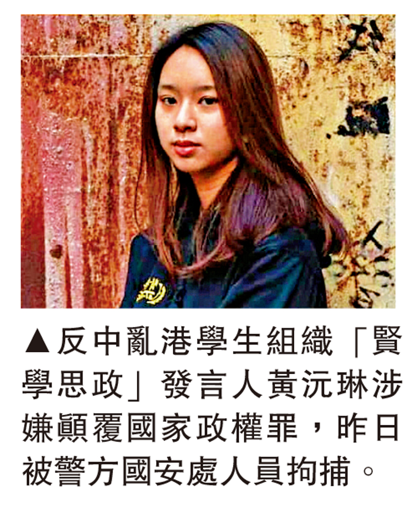 【大公報記者黃浩輝報道】警方國安處昨日(22日)拘捕反中亂港學生組織「賢學思政」發言人黃沅琳,涉嫌「串謀煽動他人實施顛覆國家政權」罪,連同在周一(20日)被捕的王逸戰、陳枳森和朱慧盈,該組織先後已有四人被捕。
