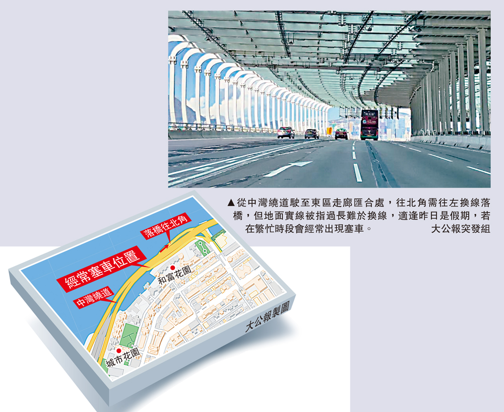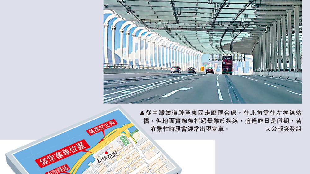 大公報記者昨日駕駛採訪車由中環駛入繞道前往東區海底隧道,當駕駛至繞道出口,近城市花園對出口的匯合處時,發現一大嚴重的「樽頸位」,加上地面實線過長,無法順利切線行駛,要減慢車速,待有空位時才可以切線轉左前往北角,難怪在平日的時段此處經常「塞爆」,若上述路段遇上交通事故,更令往東區及九龍東的道路造成癱瘓。