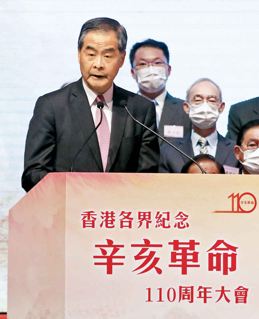 全國政協副主席梁振英昨日在「香港各界紀念辛亥革命110周年大會」上致辭指出,革命先輩們用血肉換來國家、民族的獨立和尊嚴,留下寶貴精神財富和中華民族的共同理想。他希望海內外中華兒女,包括香港的年輕人,從辛亥革命汲取歷史養分,全面和深入地認識偉大的祖國、偉大的民族、偉大的中華文化、偉大的復興使命,秉承辛亥革命先輩的遺志,將振興中華之重責,扛在自己的肩上,貢獻自己最大的力量,共享祖國完全統一和民族偉大復興的歷史榮光。