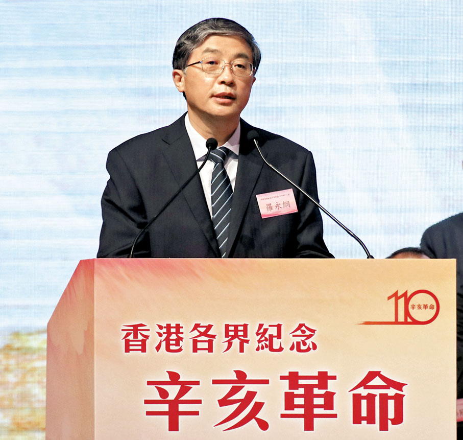 香港中聯辦副主任羅永綱昨日在「香港各界紀念辛亥革命110周年大會」上致辭時,特別談到弘揚愛國主義精神,並提出「三個必須」:必須增進對當代中國的認識,進一步強化國家認同;必須堅持「愛國者治港」,把香港治理好、發展好;必須增強作為中國人的自豪感,為實現民族振興不懈奮鬥。他表示,「愛國者治港」的新格局正逐步形成,期待並相信包括新任選委在內的特區管治團隊,會以愛國若命的精神守護「一國兩制」事業。