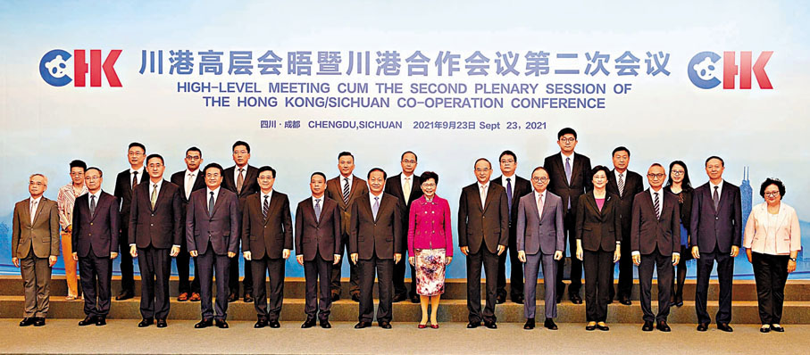 林鄭月娥表示,香港服務業發展相對比較成熟,港企可助力四川提高服務業質量。特區政府亦將推動川港業界交流合作,助力川企「走出去」。她期望在不久的將來,川港人員往來可以有序恢復,讓兩地政府和機構組織能更順利地推進合作計劃。