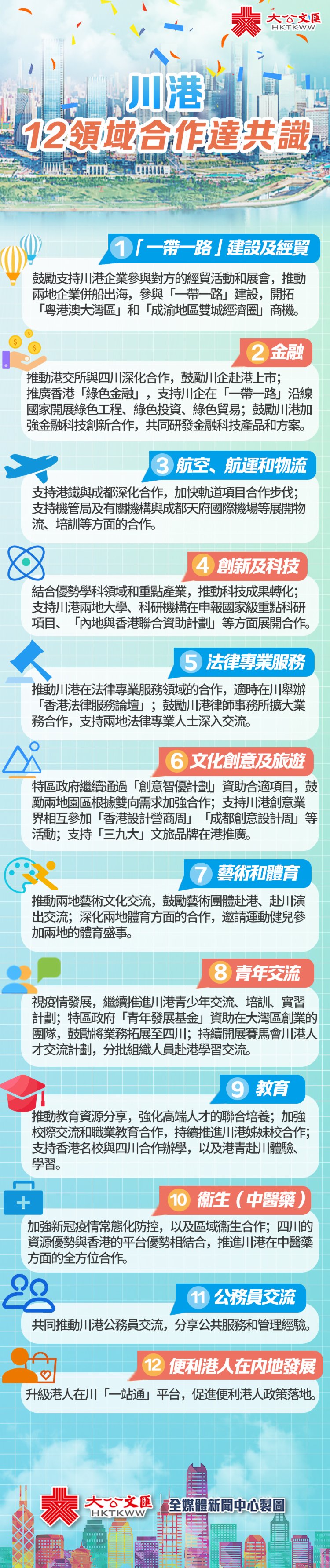 (香港文匯報記者 李兵)川港高層會晤暨川港合作會議第二次會議昨日在四川成都召開,雙方就下一步推進的重點合作事項達成意向,包括「一帶一路」建設及經貿,金融,航空、航運和物流,創新及科技,法律專業服務,文化創意及旅遊,藝術和體育,青年交流,教育,衞生(中醫藥),公務員交流,便利港人在內地發展,共計12項(見表)。率團與會的香港特區行政長官林鄭月娥表示,在國內國際雙循環的新發展格局下,香港可以進一步強化在國際循環中的「中介人」角色,同時聚焦內地市場商機,拓展內銷市場,積極成為國內大循環的「參與者」。