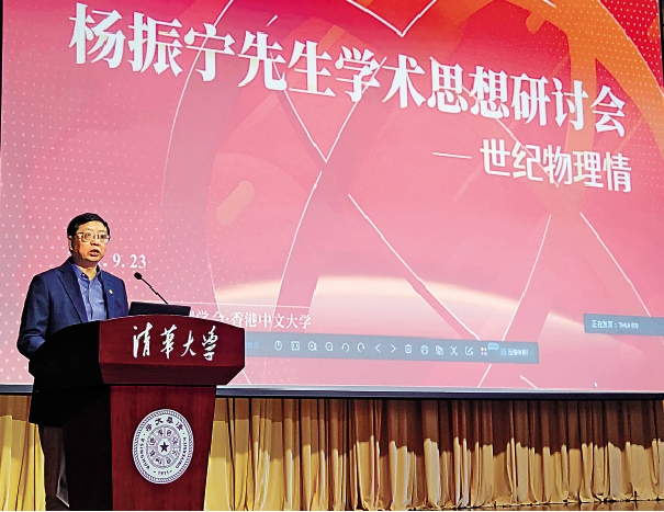 【大公報記者 張寶峰北京報道】昨日(二十三日),清華大學、中國物理學會、香港中文大學在清華大學大禮堂聯合舉辦「楊振寧先生學術思想研討會」。會議現場,眾多知名學者、視頻連線的香港專家,以及北京多所高校的學子齊聚一堂,共同回顧楊振寧的學術成就。清華大學校長邱勇表示,「楊先生是我們的指路松,是我們的大先生。」多位清華學子也對大公報記者表示,聆聽了這次研討會,不僅增加了對學術大家的了解與敬仰,更幫助自己明晰了未來的前進之路。