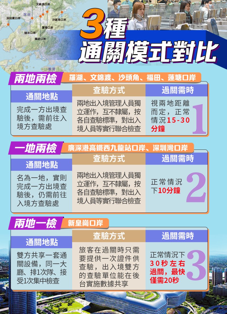 大公文匯全媒體報道,廣東省政府近日提出進一步提升粵港澳口岸通關便利化水平。據了解,「推動在粵港澳陸地口岸實施『合作查驗、一次放行』邊檢查驗模式」已列入國家移民管理局邊檢部門今年推動的新措施,在粵港口岸方面可望率先在新皇崗口岸實施。「合作查驗、一次放行」(坊間俗稱「兩地一檢」)模式是查驗模式創新,可進一步推廣到其他粵港澳口岸。「兩地一檢」「一地兩檢」「兩地兩檢」,這三種通關模式各有什麼特點?快來睇下!