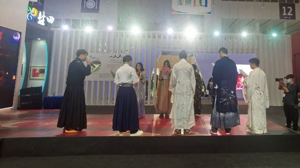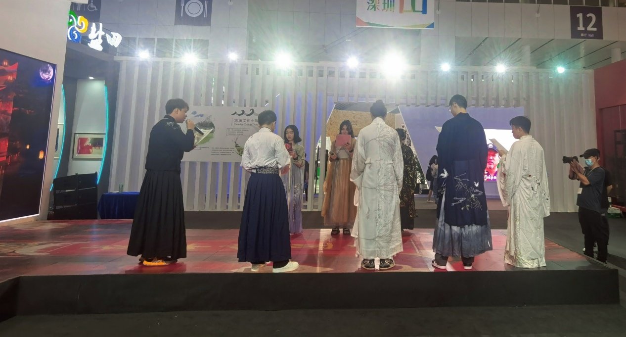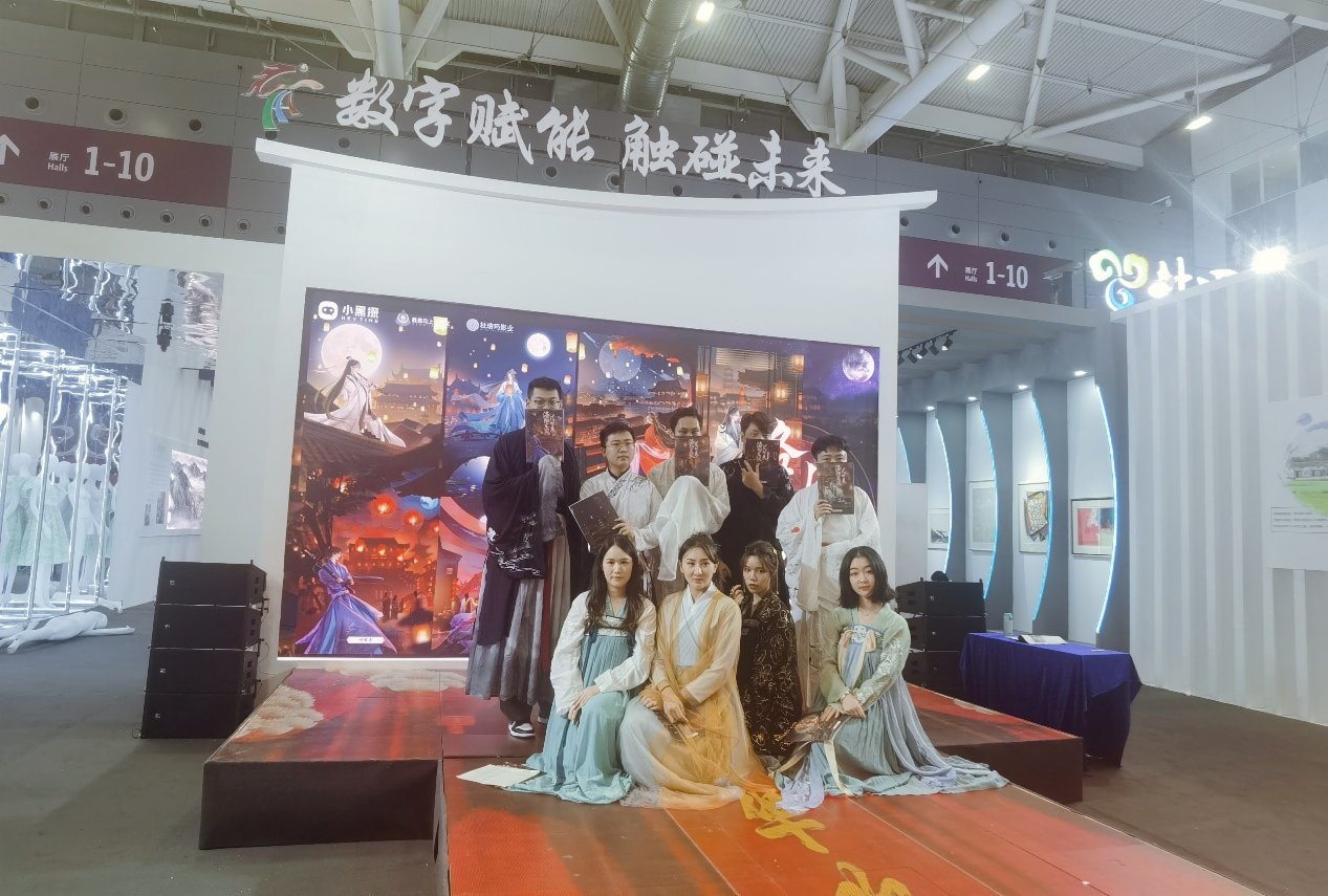 文博會現場,九位身着中華傳統服飾的劇本遊戲從業者,摘取《洛陽東風幾時來》作品選段,在舞台上通力合作,完成了兩場別開生面的劇情演繹,引得眾多在場觀眾停留圍觀,紛紛拍照留念。