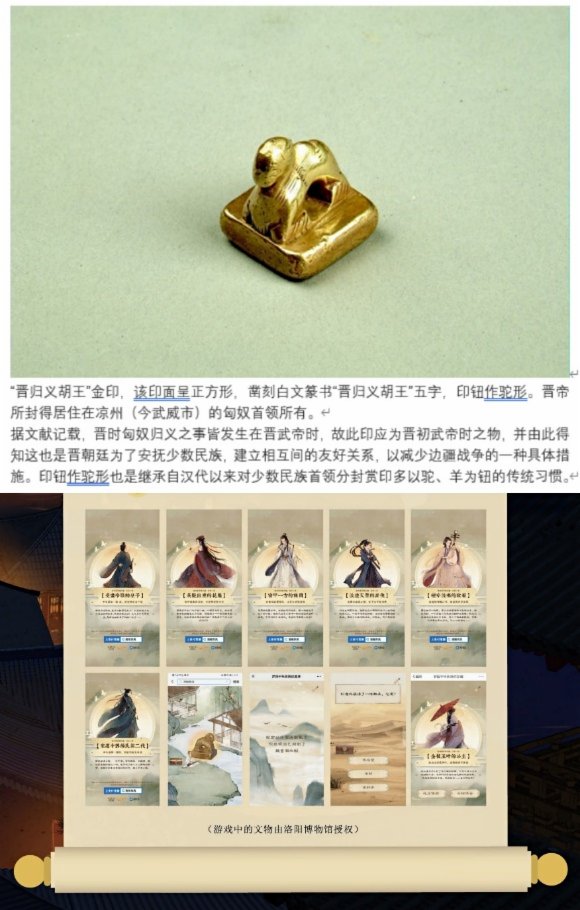 也因此,《洛陽東風幾時來》被洛陽博物館選定作為文物授權合作的首個劇本遊戲作品,打造出了一個優秀的IP聯動成果——洛陽博物館將「晉歸義胡王」金印、透雕龍紋瑪瑙璧以及金獅串飾這三件館藏文物授權融入了《洛陽東風幾時來》番外小遊戲中,藉助科技和創意的助力,令傳統與現代融合,國潮風靡一時。
